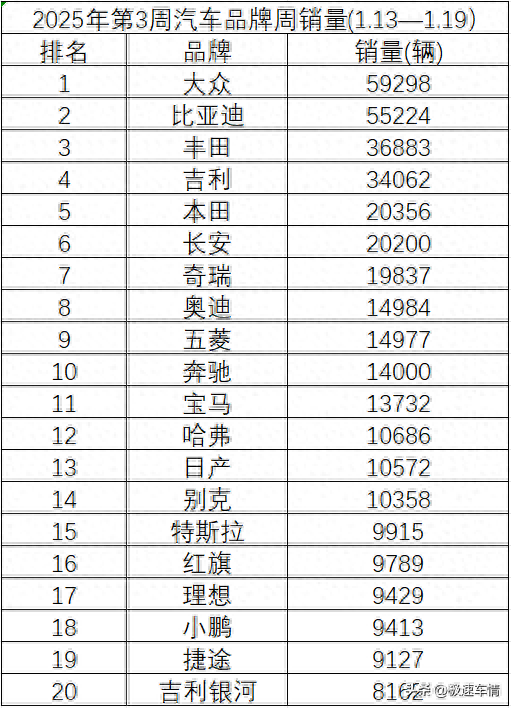 2025年第3周汽车品牌销量出炉! 大众占据第一宝座! 比亚迪第二!
